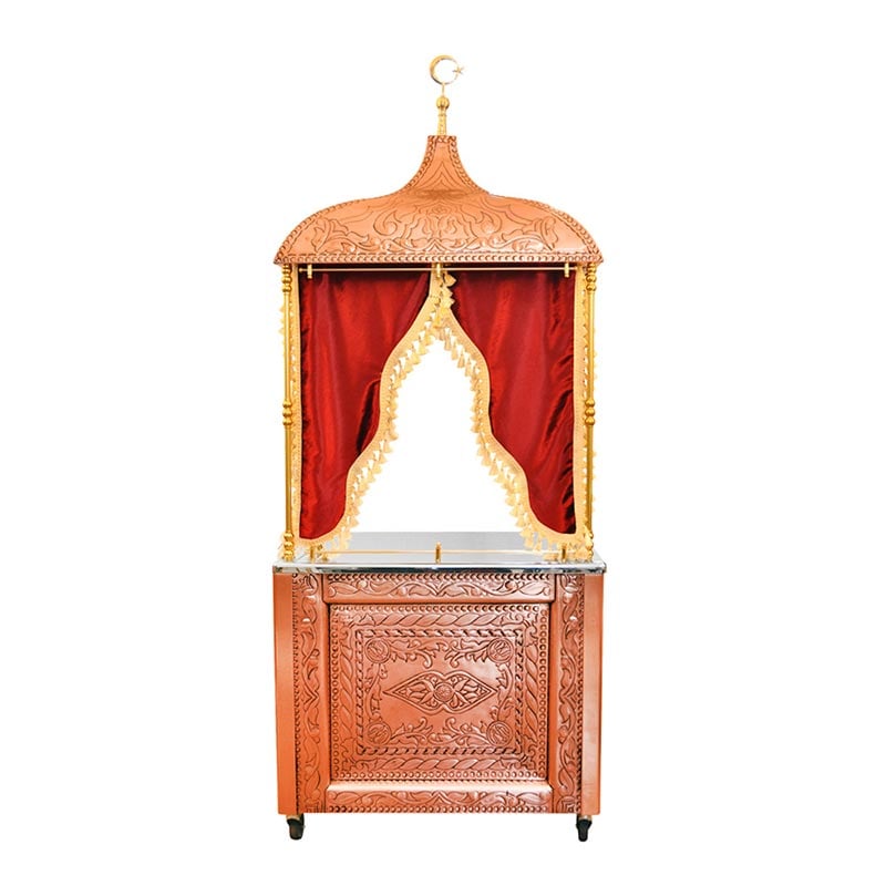 Ateşe Eren Kahveci Güzeli Sunum Arabası Sunumda farklılık, işletmede fark yaratır. El işçiliği ile bezenmiş bakır kaplama sunum standımız ile çay ve kahve sunumu görsel zenginlik sunar. Otantik ve cezbedici sunum, ortama ferahlık ve huzur katar. Farklı ölçülerdeki ve işlevsellikteki ürünlerimiz işletmenize çözüm olacaktır. Ölçüler: 90x60x255 cm