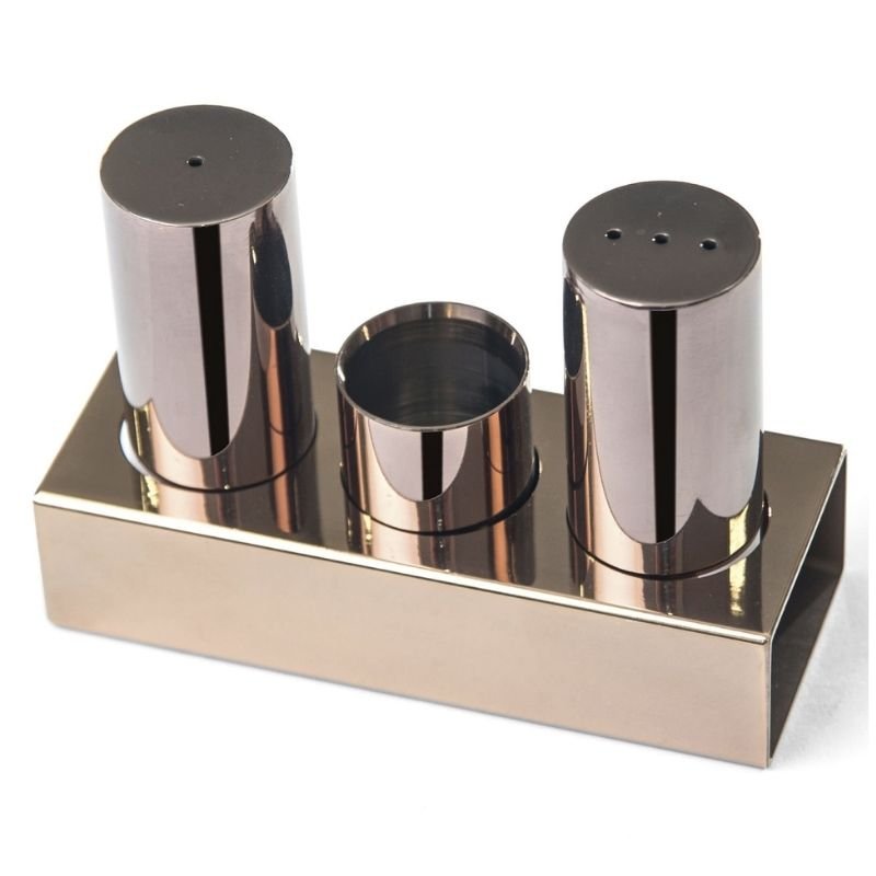 Biradlı Yuvarlak Kalın Tuzluk Takımı, 3’lü, Bakır Çelikten üretilmiştir. Bakır renklidir. Tuzluk, karabiberlik ve kürdanlıktan oluşur. Kolay temizlenebilir.