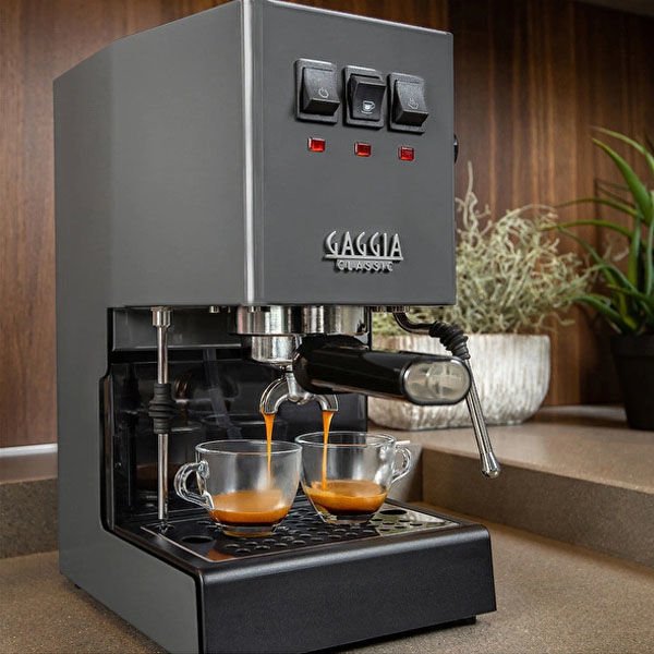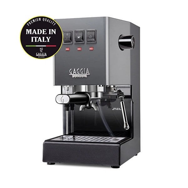 Gaggia New Classic Pro 2019, %100 İtalya’da tasarlanıp üretilmiş, profesyonel grup ve filtre tutamağı, gelişmiş buhar çubuğu ve selenoid vana teknolojisiyle kusursuz espresso deneyimi sunan şık gri bir makinedir.