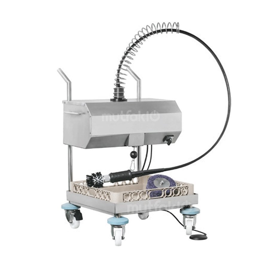 Bu makina, bir dönen fırça veya parlatma fırçası yoluyla endüstriyel mutfaklardaki tencere, tava ve kazanlara yapışan kirleri ve yağları fazla güç gerektirmeden kısa sürede, hızlı bir şekilde temizlenmesi için dizayn edilmiştir.