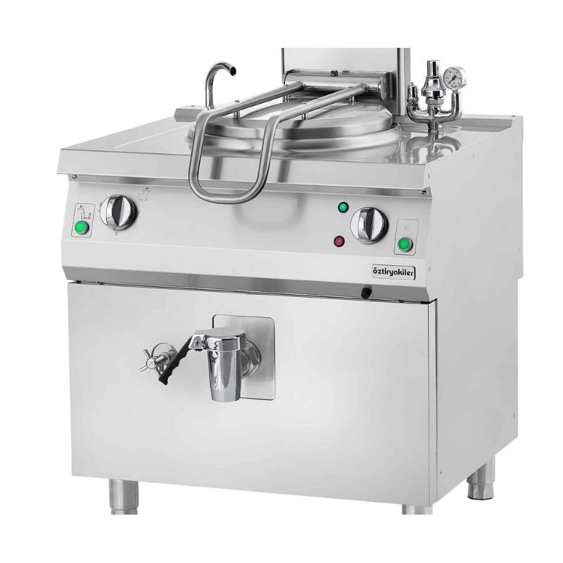 yapma imkanı sağlamaktadır. kolaylığı sağlanmıştır. mekanizması kapağın kolay açılıp kapanmasını sağlamaktadır. buhar oluşturulmaktadır ve bu sayede kaynatma tencerelerinin kazan içi, yan ve taban bölümlerinde homojen ısı dağılımı sağlanmaktadır. sağlamaktadır. Güvenliği arttırmak için emniyet tertibatlı gaz musluğu ve alev denetleme için termokupl kullanılmıştır. şekilde artmasını engellemektedir. buhar tahliye imkanı sağlanmıştır. kolay çalıştırma imkanı sağlanmıştır. Ayrıca panelde bulunan sinyal lambaları ile çalışma veya ateşleme gibi durumlar izlenebilmektedir. ön panelden selenoid valf ile kontrol edilebilmektedir. Cihazların üst tablasında bulunan krom kaplı batarya ile kazan doldurulabilmektedir. Cidar su seviyesi düştüğü zaman rezistansı ve kazanı korumak için emniyet termostatı kullanılmıştır. |